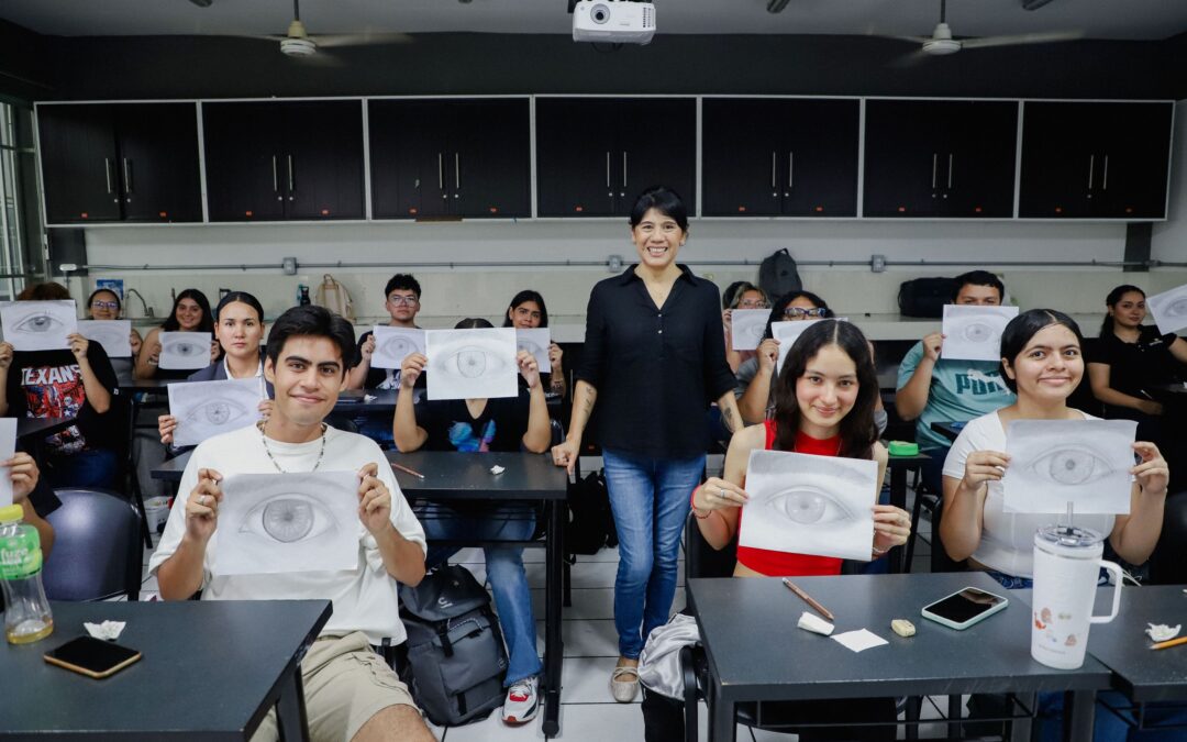 Durante la sesión, las y los estudiantes practicaron la elaboración de un ojo humano, añadiendo detalles y proporciones bajo la guía experta de la docente, lo que les permitió un acercamiento práctico a los principios del retrato.