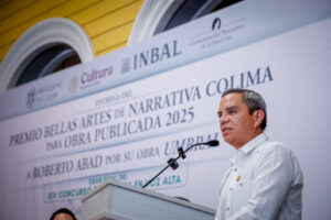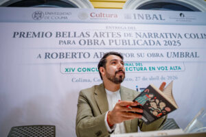 Este lunes, en la Pinacoteca Universitaria, se llevó a cabo la entrega del Premio Bellas Artes de Narrativa Colima por Obra Publicada 2025 al escritor morelense Roberto Abad, por su libro de cuentos Umbral. Este premio lo otorgan la Secretaría de Cultura del Gobierno de México y el Instituto Nacional de Bellas Artes y Literatura (INBAL), a través de la Coordinación Nacional de Literatura (CNL) y la Universidad de Colima.