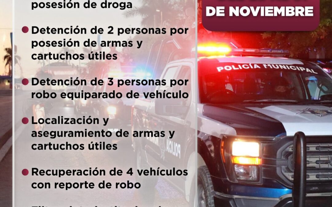 La Dirección de Seguridad Pública de Manzanillo informa que, durante los patrullajes permanentes realizados en el municipio, se logró la detención de diversas personas: cinco por posesión de sustancias ilícitas, tres por robo de vehículo y dos más por portación de armas de fuego con cartuchos útiles.
