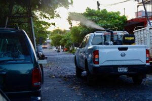 Personal de Vectores fumiga durante estos cuatro días en los municipios de Colima, Manzanillo, Tecomán y Villa de Álvarez, de manera focalizada en quince colonias, fraccionamientos y comunidades, de las cuales diez son de Tecomán, en donde se ha detectado mayor presencia del mosco Aedes aegypti.