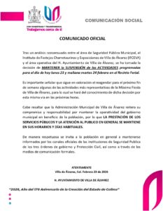 Tras un análisis consensuado entre el área de Seguridad Pública Municipal, el Instituto de Festejos Charrotaurinos y Exposiciones de Villa de Álvarez (IFCEVA) y el área operativa del H. Ayuntamiento de Villa de Álvarez, se ha tomado la decisión de MANTENER la SUSPENSIÓN de las ACTIVIDADES programadas para el día de hoy lunes 23 y mañana martes 24 febrero en el Recinto Ferial.