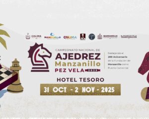 Manzanillo será sede del Campeonato Nacional de Ajedrez ‘Pez Vela 2025’, que se realizará del 31 de octubre al 2 de noviembre en el Hotel Tesoro Manzanillo, ubicado en la playa La Audiencia, evento que se enmarca en los festejos por el 200 Aniversario de la Fundación de Manzanillo como Puerto Comercial, con una bolsa de premios que asciende a 300 mil pesos en efectivo y especie, consolidando a este campeonato como uno de los más importantes del calendario ajedrecístico en México.