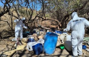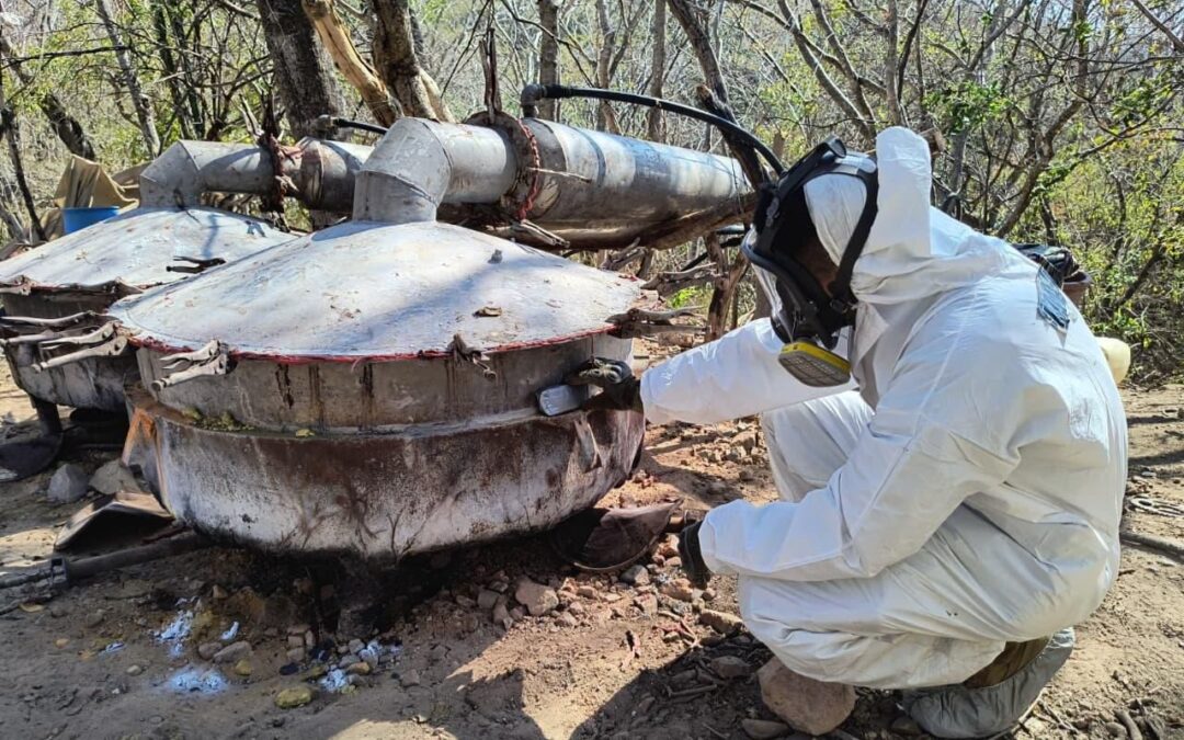 Esta acción se llevó a cabo durante patrullajes de vigilancia aérea y terrestre, durante los cuales se localizó y aseguró un Laboratorio Clandestino, en donde fueron destruidos aproximadamente mil litros de Fenil-2 Propanona, 400 litros de tolueno y 100 kilogramos de sosa caústica.