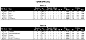 En el Grupo A, Puerto Rico marcha invicta en primer lugar con 13 puntos tras sus triunfos ante Costa Rica, Cuba y Perú; en segundo sitio está Perú con 12 unidades al ganar a Costa Rica, Cuba y México, y perder con Puerto Rico. México es tercero con 10 puntos con triunfos ante Cuba y Costa Rica y derrota con Perú, con lo que amarra boleto a cuartos de final, pero la noche de este jueves se mide a las puertorriqueñas para jugarse el pase directo a las semifinales, en caso de obtener la victoria.