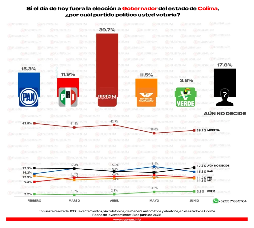 El partido Morena en Colima continúa punteando las preferencias este 2025 rumbo al 2027, año que se definirá gubernatura, congreso local y alcaldías, esto de acuerdo a la encuestadora Rubrum (https://rubrum.info/tendencias-de-los-precandidatos-a-la-gubernatura-de-colima-rumbo-al-2027-junio-2025/).