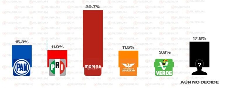 ++Morena tiene tendencia de 39.7% de preferencias, el PAN está en un tercer lugar con 15.3%, debajo de quienes aún no deciden por quién votar con 17.8%
