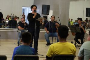 En esta presentación especial para las infancias, las niñas y los niños presentes pudieron conocer los instrumentos que componen un ensamble de cámara, además de que participaron en juegos y dinámicas que propiciaron la convivencia armónica, el aprendizaje y la integración comunitaria.
