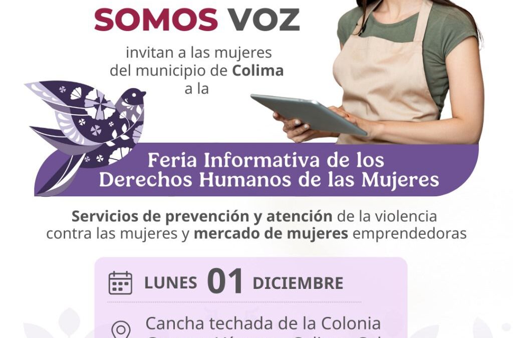 El Gobierno del Estado de Colima, a través del Instituto Colimense de las Mujeres (ICM), invita a las mujeres, adolescentes y familias de la ciudad para participar en la Feria Informativa de los Derechos Humanos de las Mujeres y de Servicios, que se realizará este próximo lunes 1 de diciembre, de 5:00 a 7:00 de la tarde, en la cancha techada de la colonia Gustavo Vázquez, de esta capital.