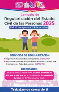 Villa de Álvarez, Col.- Para garantizar el derecho a la identidad de las y los villalvarenses, el Ayuntamiento de Villa de Álvarez, a través del DIF Municipal y de la Oficialía del Registro Civil, se sumará a la Campaña de Regularización del Estado Civil de las Personas 2025, que ofrecerá servicios de manera gratuita.