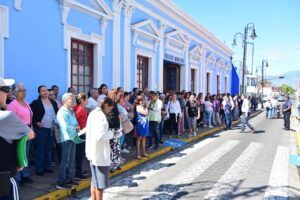 En el edificio central del Ayuntamiento, que en el patio central se encuentran instaladas mesas receptoras de cobro del impuesto predial, las personas que en gran número se encontraban esperando para realizar sus trámites, abandonaron sus lugares y se trasladaron al área segura señalada por Protección Civil, donde también se concentraron los trabajadores de las distintas oficinas que funcionan en este inmueble.