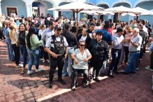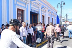 En el edificio central del Ayuntamiento, que en el patio central se encuentran instaladas mesas receptoras de cobro del impuesto predial, las personas que en gran número se encontraban esperando para realizar sus trámites, abandonaron sus lugares y se trasladaron al área segura señalada por Protección Civil, donde también se concentraron los trabajadores de las distintas oficinas que funcionan en este inmueble.