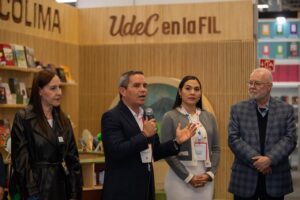 Previamente, la titular del Poder Ejecutivo estatal acompañó al rector de la Universidad de Colima, Christian Jorge Torres Ortiz Zermeño; José Trinidad Padilla López, presidente de la FIL y otras autoridades universitarias, en la inauguración del módulo de la máxima casa de estudios colimense dentro de la FIL Guadalajara 2025.