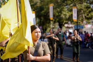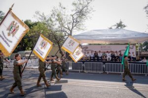 La escolta de Bandera del Bachillerato 4, con sus 47 años de trayectoria, marchó con paso firme, seguida por la Banda de Guerra Monumental, integrada por alumnos de seis planteles de bachillerato, cuyo ritmo y cadencia marcaron el corazón del contingente.
