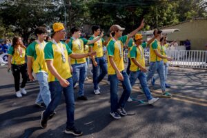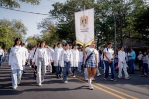 El desfile universitario inició con el bloque histórico, a cargo de estudiantes del Bachillerato 3, quienes portaron con solemnidad el Pabellón Institucional, el Pendón Universitario, los estandartes del 85 aniversario y una galería de fotografías que narran la evolución de la institución desde su fundación como Universidad Popular de Colima en 1940.