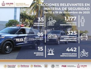Como resultado del operativo, se logró la detención de 35 personas en distintos hechos, por su probable participación en delitos de violación a la Ley Federal de Armas de Fuego y Explosivos, contra la salud, violencia familiar y diversas faltas administrativas, esto durante el periodo comprendido del 12 al 19 de diciembre en el estado de Colima.