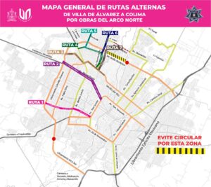 Villa de Álvarez, Col.- Por los trabajos del Puente Vehicular Arco Norte que el Gobierno del México construye en el crucero de la Avenida Venustiano Carranza y Paseo Miguel de la Madrid Hurtado de la Ciudad de Colima, el Municipio de Villa de Álvarez propone siete rutas alternas al Tercer Anillo Periférico que sugiere a automovilistas y motociclistas.
