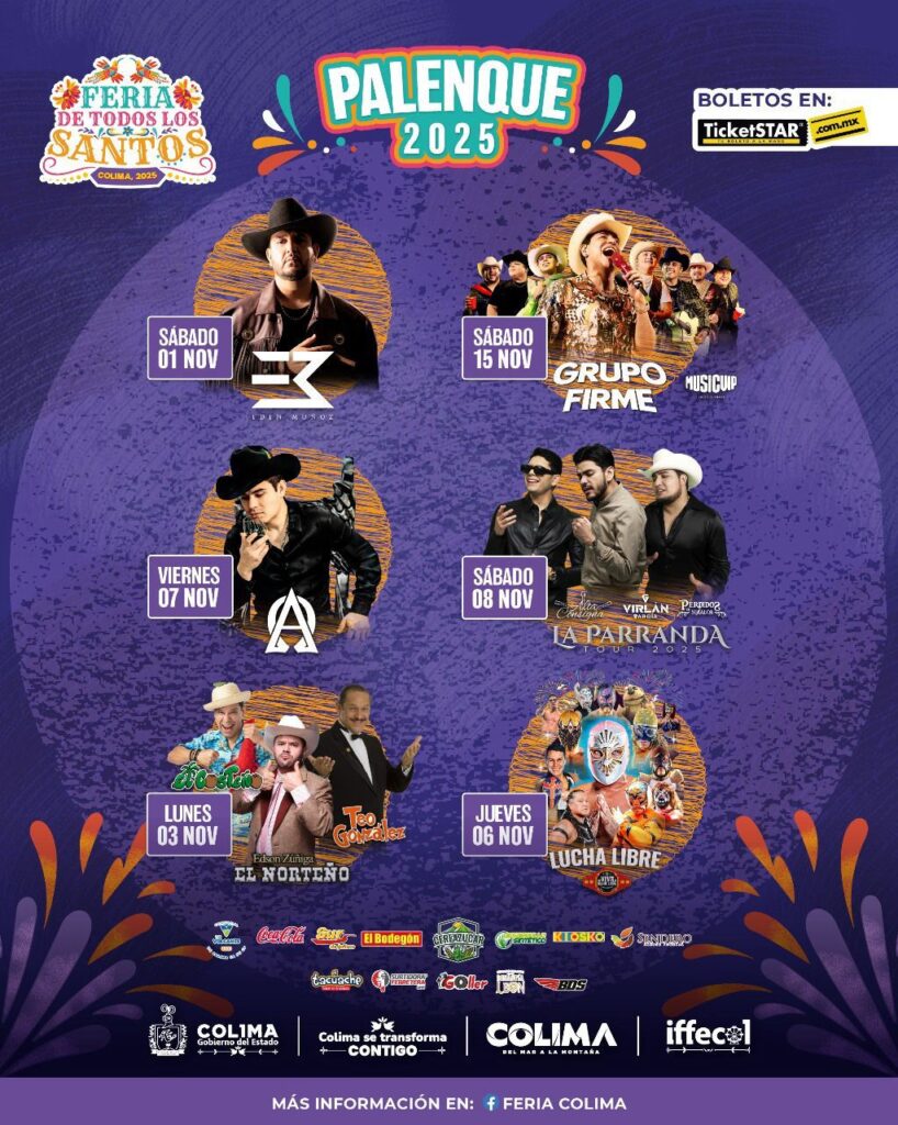 El secretario de Desarrollo Económico (Sedeco) del Gobierno del Estado de Colima, Francisco Javier Rodríguez García y el director general del Instituto de Fomento de Ferias y Exposiciones (Iffecol), Rodolfo Aguilar Dávalos, presentaron este martes la cartelera artística del Palenque y el cartel oficial de la edición 86 de la Feria de Todos los Santos Colima 2025, que será del 31 de octubre al 17 de noviembre.