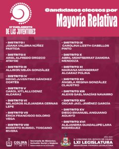Mientras que por representación proporcional son: Andrea de la Luz Ruiz Trujillo, Alejandra Nayeli Ramírez Reyes, José Gudiño Ramírez, Alondra Montserrat Cortés Valdez, Nefertiti Virgen Castellanos, Mateo Toscano Cruz, Enrique Magaña Baltazar, Karol Matzayani Vázquez y Andrea Jaqueline Contreras Contreras.
