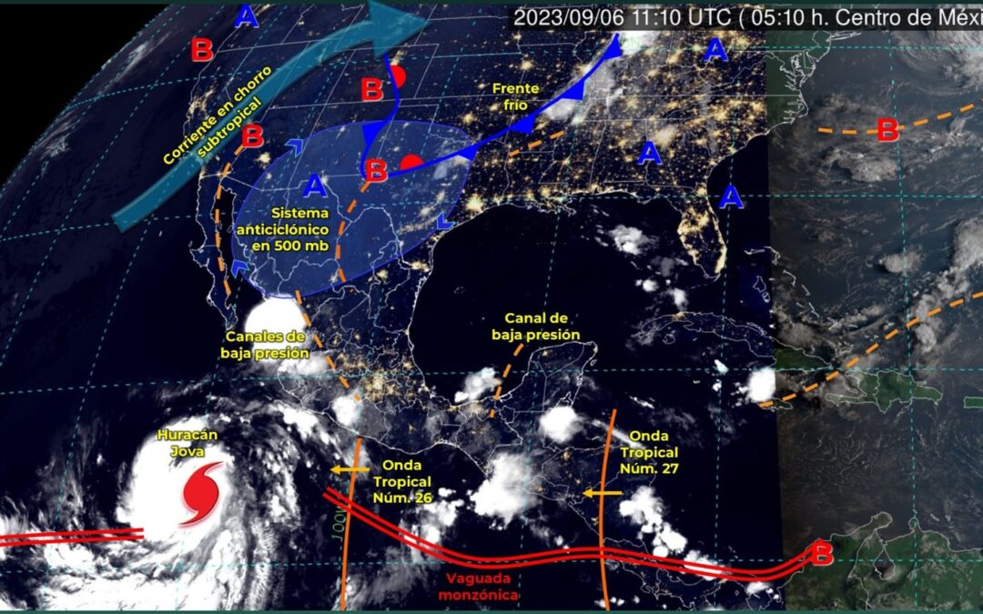 Respecto a ‘Jova’, en las últimas horas se intensificó a huracán categoría 1 en la escala Saffir-Simpson, su centro se localiza a 825 kilómetros al suroeste de Playa Pérula Jalisco y a 1,035 kilómetros de Cabo San Lucas, BCS. Presenta vientos máximos sostenidos de 140 kilómetros por hora y rachas de 165 km/h. Su circulación produce lluvias muy fuertes en Colima, Jalisco, Michoacán y Nayarit; rachas de vientos de 40 a 60 km/h y oleaje de hasta 3 metros en las costas de Colima, Jalisco y Michoacán.
