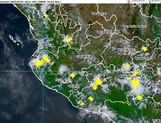 Para este sábado 22 de julio, en algunas zonas de Colima podrían registrarse lluvias fuertes con puntuales muy fuertes, de hasta 75 milímetros, al igual que en Sonora, Chihuahua, Sinaloa, Nayarit, Jalisco, Guerrero, Oaxaca, Veracruz y Campeche.