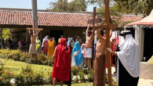 La representación reunió a residentes, familiares y colaboradores en un ambiente de respeto, reflexión y comunidad. Durante el recorrido se escenificaron algunas de las estaciones más significativas del Viacrucis: la condena de Jesús, su encuentro con María, la ayuda de Simón de Cirene para cargar la cruz, así como las caídas que simbolizan el sufrimiento humano. Cada escena fue interpretada con sensibilidad, destacando el mensaje de solidaridad, fe y esperanza.