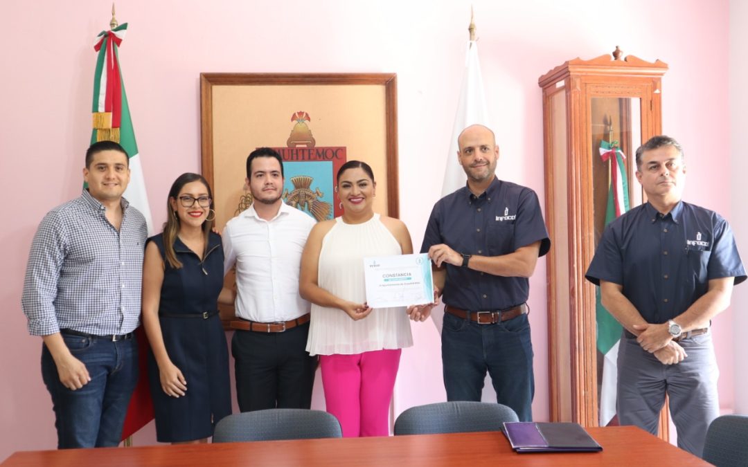 La alcaldesa Gabriela Mejía Martínez, recibió de manos del comisionado presidente del Instituto de Transparencia, Acceso a la Información Pública y Protección de Datos del Estado de Colima (Infocol), Francisco José Yáñez Centeno y Arvizu, la constancia que acredita que el Ayuntamiento de Cuauhtémoc cumplió al 100% en esta materia.