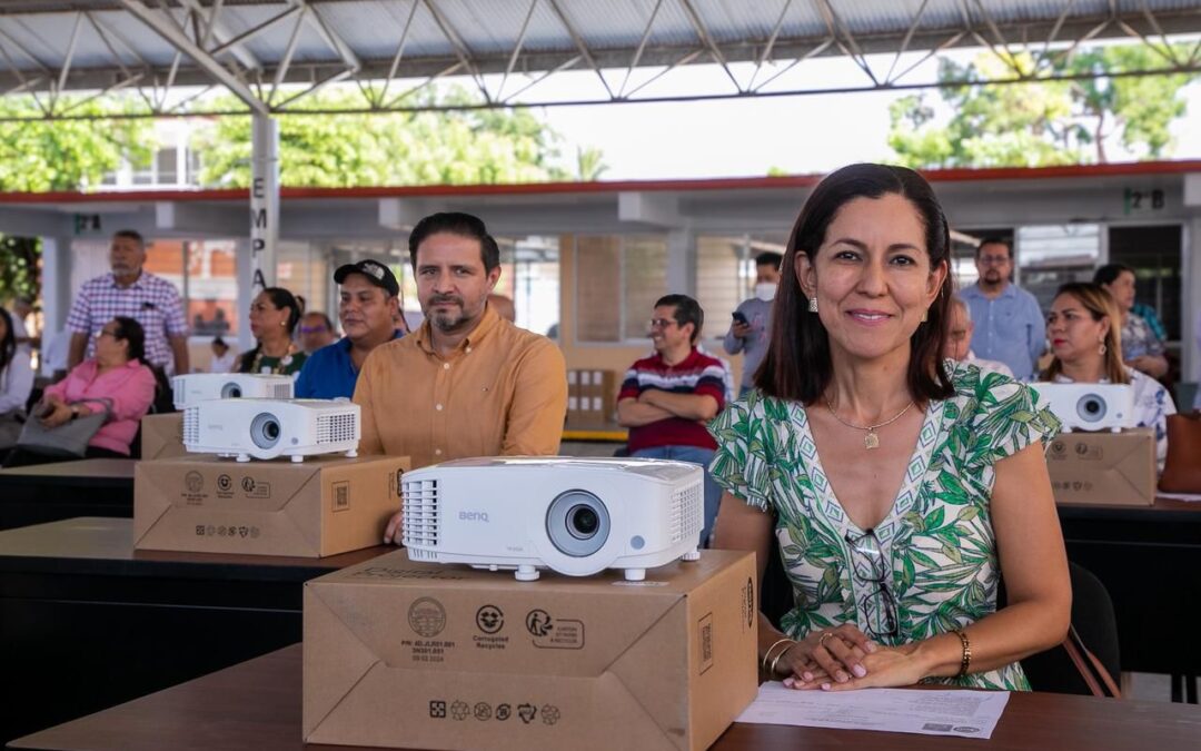 La gobernadora Indira Vizcaíno Silva, entregó 242 juegos de escritorios y sillas para docentes de secundaria, así como 81 proyectores a 18 planteles urbanos de los municipios de Colima y Villa de Álvarez, con inversión superior a 2.3 millones de pesos, en un evento que se realizó este lunes en la escuela secundaria Manuel Álvarez, en el municipio villalvarense.