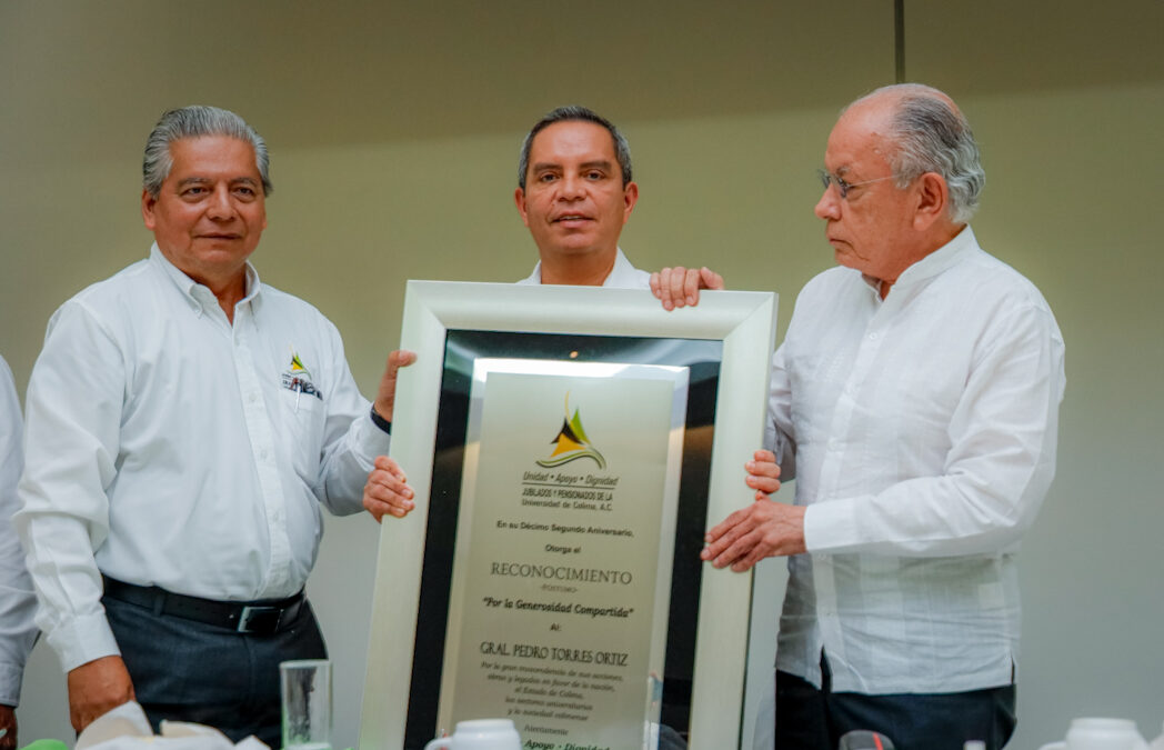 Este martes, la Asociación de jubilados y pensionados de la Universidad de Colima, al celebrar su décimo segundo aniversario, otorgó el reconocimiento “Por la generosidad compartida” -de manera póstuma- al General Pedro Torres Ortiz “por la gran trascendencia de sus acciones, obras y legados en favor de la nación, el estado de Colima, los sectores universitarios y la sociedad colimense”. En nombre de la familia, recibió el reconocimiento el Dr. Christian Torres Ortiz Ocampo, hijo del general.