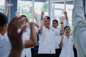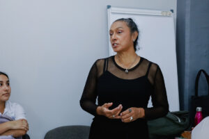 Carmen Solorio inició mostrando que el teatro como género es una herramienta de autoconocimiento y expresión. Compartió parte de su trayectoria profesional y explicó cómo esta disciplina permite comprender emociones, narrar historias y generar vínculos con otras personas. A partir de ello, las y los asistentes realizaron ejercicios de respiración y conciencia corporal, enfocados en reconocer el cuerpo como un espacio de presencia, escucha y comunicación.
