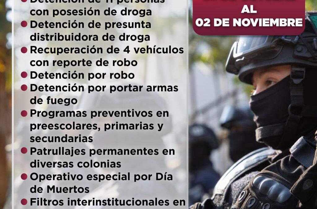 Durante esta semana también se llevaron a cabo operativos especiales de seguridad y vigilancia con motivo del Día de Muertos, en coordinación con Protección Civil y autoridades de seguridad estatales y federales.
