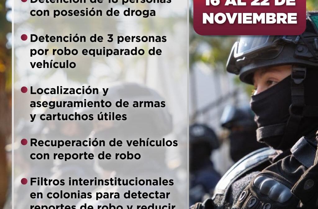 La Dirección de Seguridad Pública de Manzanillo informa que, durante patrullajes permanentes realizados en el municipio, se logró la recuperación de siete vehículos con reporte de robo. Asimismo, fueron detenidas dieciocho personas por posesión de sustancias ilícitas, y tres más por posesión de armas con cartuchos útiles.