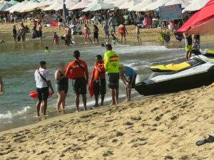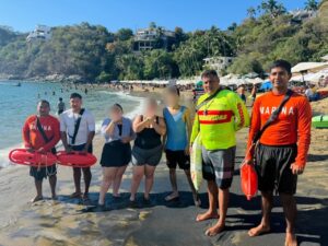 Guardavidas de la Unidad Estatal de Protección Civil (UEPC) del Gobierno del Estado de Colima, en coordinación con elementos de la Secretaría de Marina del gobierno federal, realizaron el rescate de tres personas que se encontraban en riesgo de ahogamiento, en aguas marinas en la playa La Audiencia, en Manzanillo.