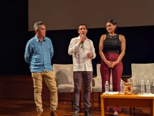 En la conferencia brindada por el ex clavadista olímpico estuvo la deportista colimense Naomi Alejandra Cruz Toledo, mundialista de voleibol de playa, quien habló a nombre de la comunidad deportiva presente en el Teatro Hidalgo, en la capital del estado.