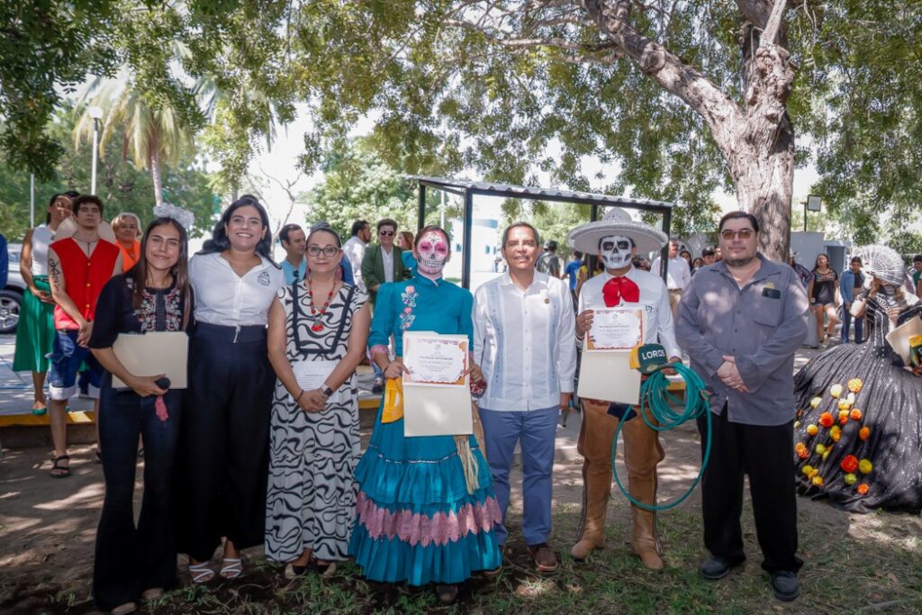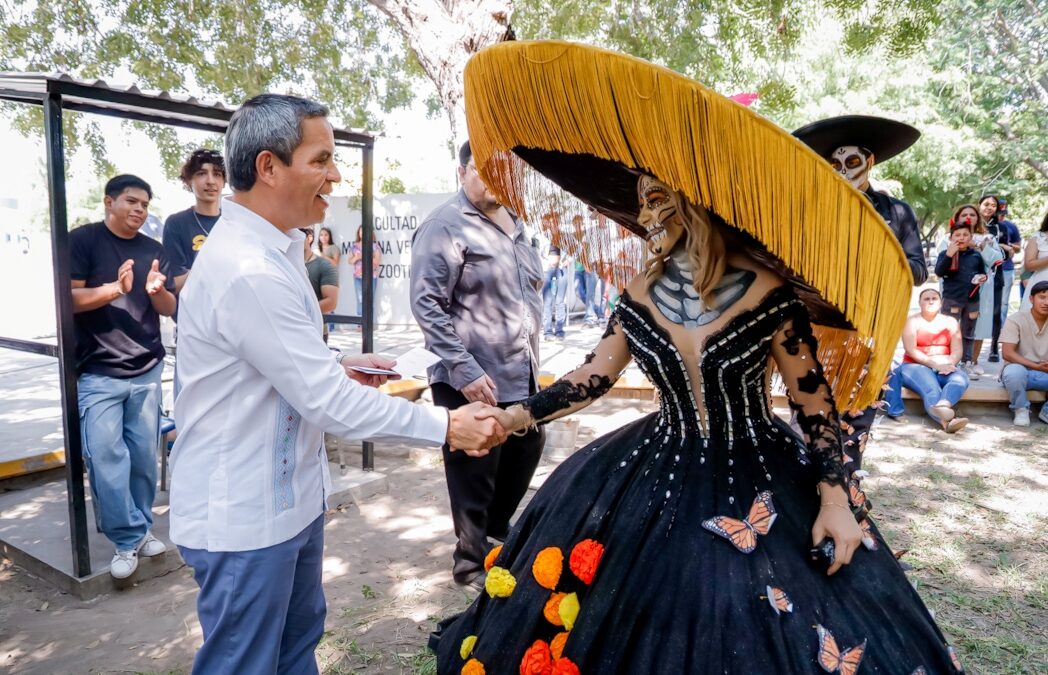 El rector de la Universidad de Colima, Christian Jorge Torres Ortiz Zermeño, convivió con estudiantes, docentes y personal de la Facultad de Medicina Veterinaria y Zootecnia (FMVZ) durante el tradicional concurso de Catrinas, Catrines y puertas decoradas, que este año se realizó con causa en el marco de la jornada institucional “Un día para donar”.