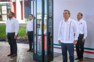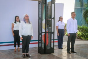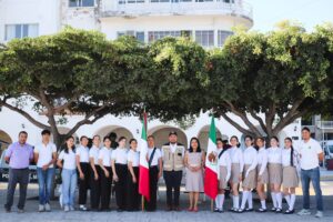 En el puerto de Manzanillo, Ana María Gallardo Vázquez, delegada universitaria, en representación del rector Christian Torres Ortiz Zermeño asistió a la ceremonia por el Día de la Bandera organizada por el Ayuntamiento de este municipio. El evento se realizó en el centro histórico y estuvo encabezado por Rocío Beltrán, secretaria del ayuntamiento en representación de Rosa María Bayardo, presidenta municipal.