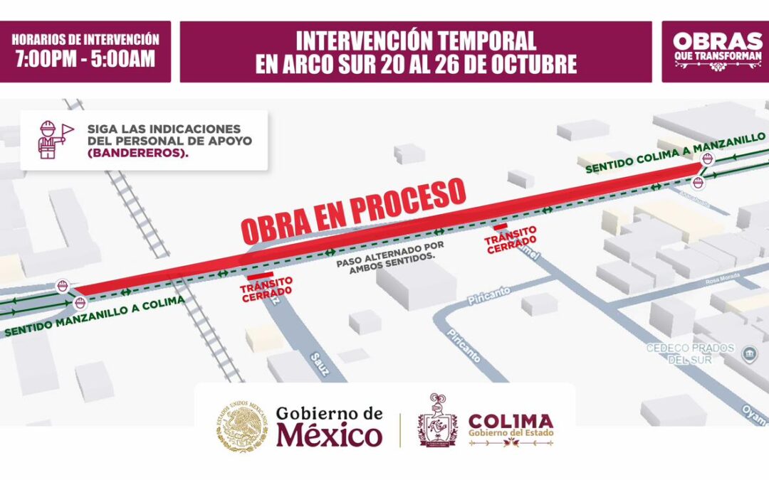 La Secretaría de Infraestructura, Desarrollo Urbano y Movilidad (Seidum) del Gobierno del Estado de Colima informa que durante esta semana -del lunes 20 al domingo 26 de octubre-, se llevarán a cabo cierres intermitentes en el área donde se construye el Paso Superior Ferroviario ‘Arco Sur’, en un horario de las 7:00 de la tarde a las 5:00 de la mañana.