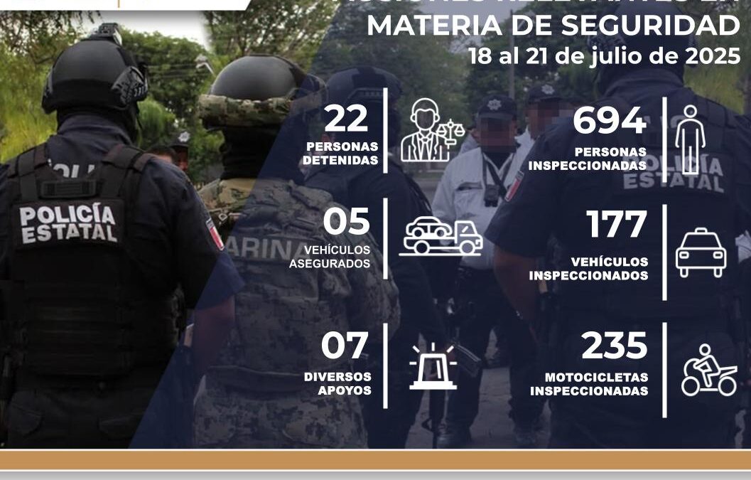 Además, las unidades policiales realizaron recorridos estratégicos en principales avenidas, colonias y zonas de convivencia, con el objetivo de mantener el orden público y garantizar la seguridad de las y los ciudadanos, durante los cuales, se inspeccionaron 694 personas, 177 vehículos y 245 motocicletas y se aseguraron 5 vehículos.