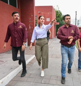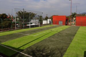 La alcaldesa informó que en esta unidad se interviene toda la cancha de futbol, mediante la colocación de nuevo pasto sintético, mejoramiento de cercos perimetrales, instalación de porterías nuevas y fortalecimiento del sistema de alumbrado.