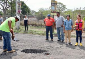 Villa de Álvarez, Col.- La Presidenta Tey Gutiérrez Andrade supervisó los trabajos del programa Operación Bacheo que se realiza en avenidas principales de Villa de Álvarez, intensificados en vialidades primarias ante el inicio de la temporada de lluvias.