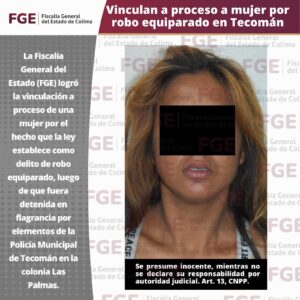 La Fiscalía General del Estado (FGE) logró la vinculación a proceso de una mujer por el hecho que la ley establece como delito de robo equiparado, luego de que fuera detenida en flagrancia por elementos de la Policía Municipal de Tecomán en la colonia Las Palmas.
