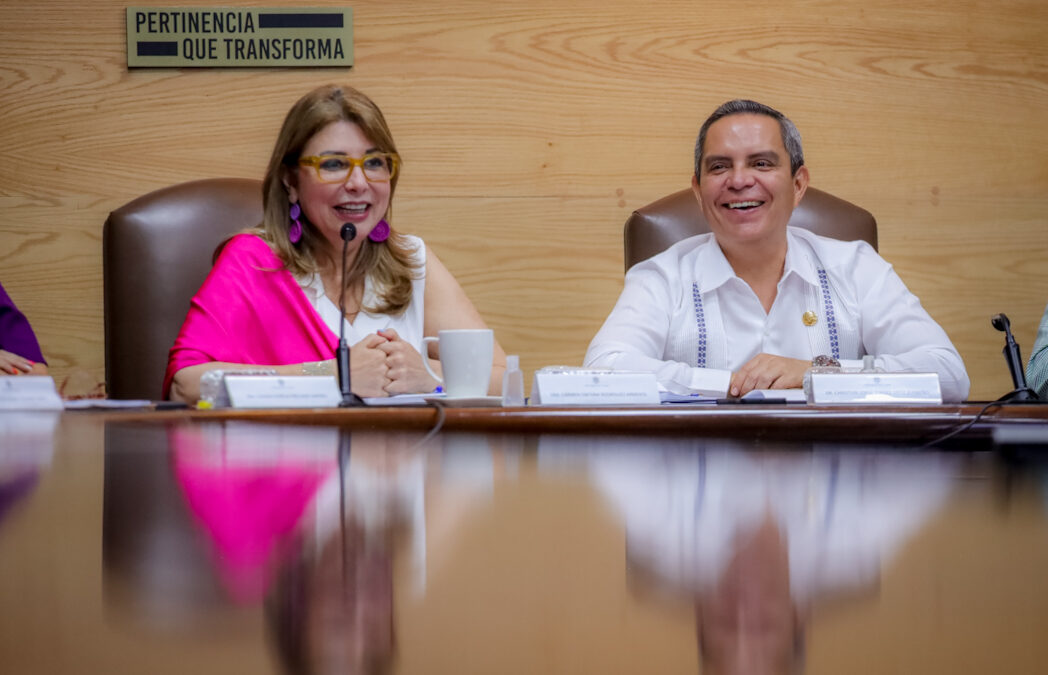 La mañana de este martes 19, en la sala de juntas de Rectoría de la Universidad de Colima, la doctora Carmen Rodríguez Armenta, directora general del Centro Nacional de Evaluación para la Educación Superior (Ceneval), sostuvo una reunión de trabajo con el rector Christian Jorge Torres Ortiz Zermeño, funcionarios y funcionarias del área educativa y con directivos de distintas facultades. Abordaron temas como los exámenes en línea, las microcredenciales, la colaboración de universitarios en el diseño de exámenes y sobre los próximos eventos que organizará este Centro y donde la UdeC puede participar.